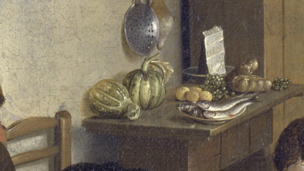 Heimbach versammelt Kürbisse, Fische und andere Lebensmittel auf einem kleinen Beistelltisch am Bildrand. Somit schafft er ein kleines Stillleben im Hintergrund des Genrebildes.